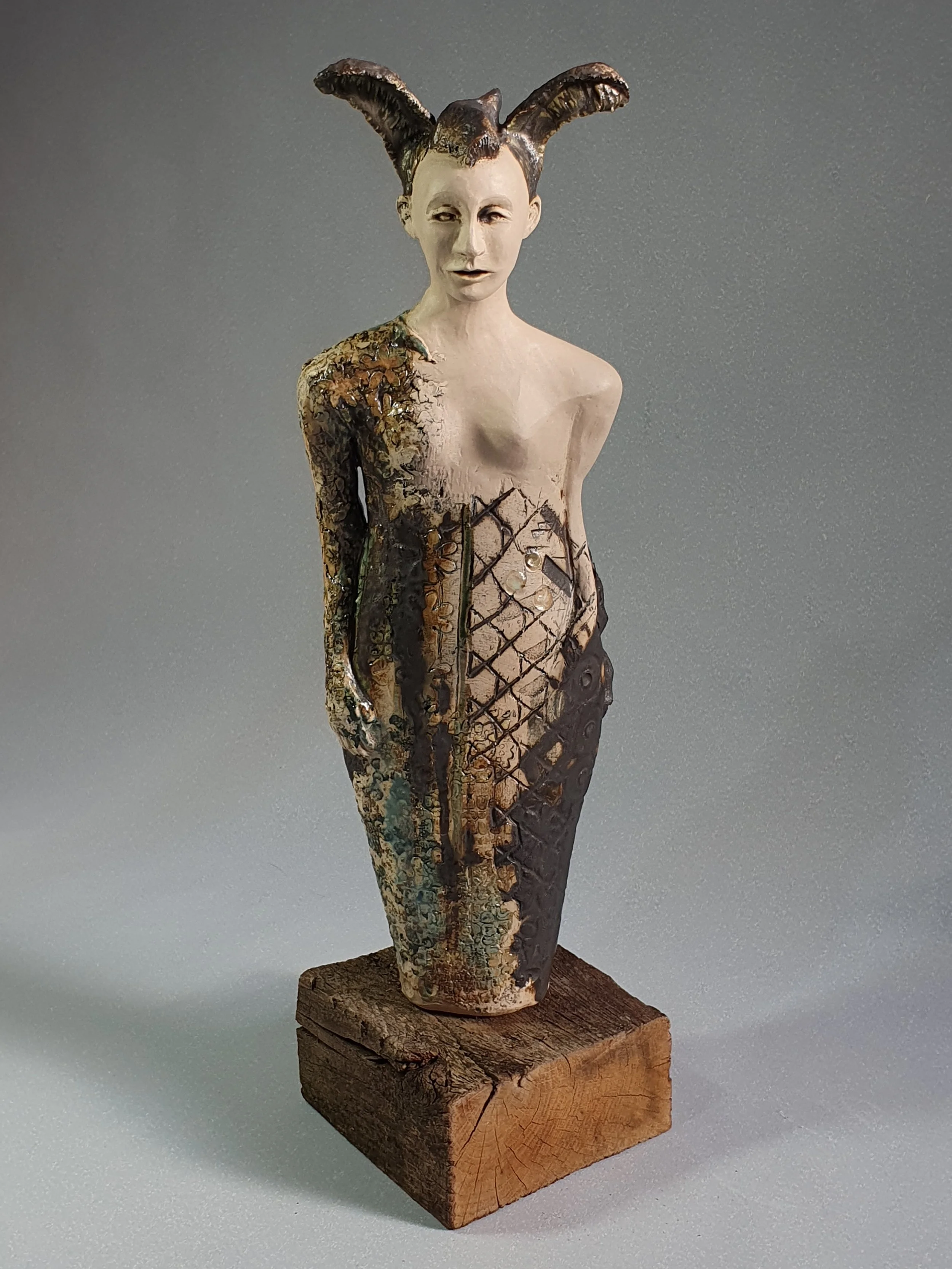 Medium sized Ceramic Figurative Sculptures: ‘NATURE’s Voices: a shared narrative’, My process involves combining environments with construction and expression: I sketch, I forage, collecting images, recording feelings, emotions, experiences and stories. Memories are transient and ephemeral; my work is an attempt to capture that memory of what I see and experience, representing it in a more permanent form.   My sculptures represent the narrative between the Feminine Aspect, Environments and Pagan Mythos. Once I start manipulating the clay body, the result is a collaboration between my hands and the clay itself; it picks up my gestures and moods, responding and revealing itself. Each of these smaller sculptures has established its own personality and is a unique piece. They can be displayed outside OR indoors.. They love conversations.